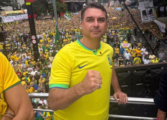 Flávio Bolsonaro usa colete à prova de balas em ato na Paulista